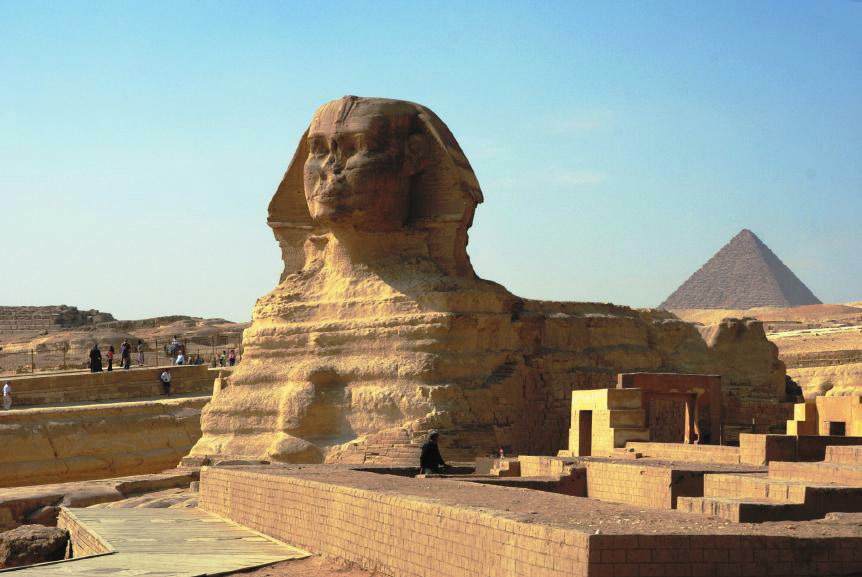 古埃及第四王朝极为兴盛,所建金字塔也大。胡夫的儿子哈夫拉(又叫齐夫林)的金字塔规模比胡夫金字塔略小,但它的前面有一座用整块石头雕刻而成的巨大的狮身人面像,希腊人称之为斯芬克斯。该像高20米,长约62米,据说其面容以哈夫拉为模特。大斯芬克斯与金字塔交相辉映,是古埃及人聪明智慧的象征。