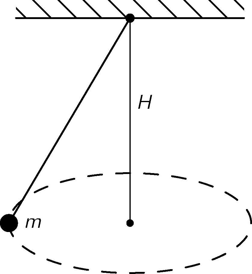 7.15 质量为 m 的物体系于一根任意长的弦的一端,被悬挂在一无摩擦的枢轴上,并使其在水平圆轨道上旋转,旋转平面在枢轴点的下方 H 距离,如图7-2所示。求物体在轨道上的旋转周期 T 。