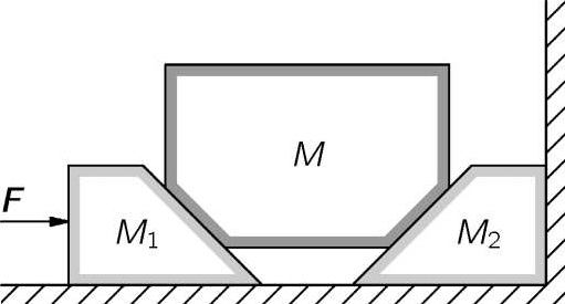 7.14 用两个完全一样的、表面光滑的45°楔形物 M 1 和 M 2 推动表面光滑、质量为 M =384kg的物体,如图7-1所示。两个楔形物都放置在光滑水平面上。其中, M 2 靠在竖直墙面上;一595kg重量的水平力 F 作用在 M 1 上。