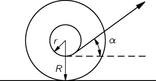 15.18 质量为 m 、外径为 R 、转动惯量为 I 的空心圆柱可以在桌面上无滑动地滚动。力 F 与水平方向成 α 角,作用在内径上,内径大小为 r 。见图15-10。