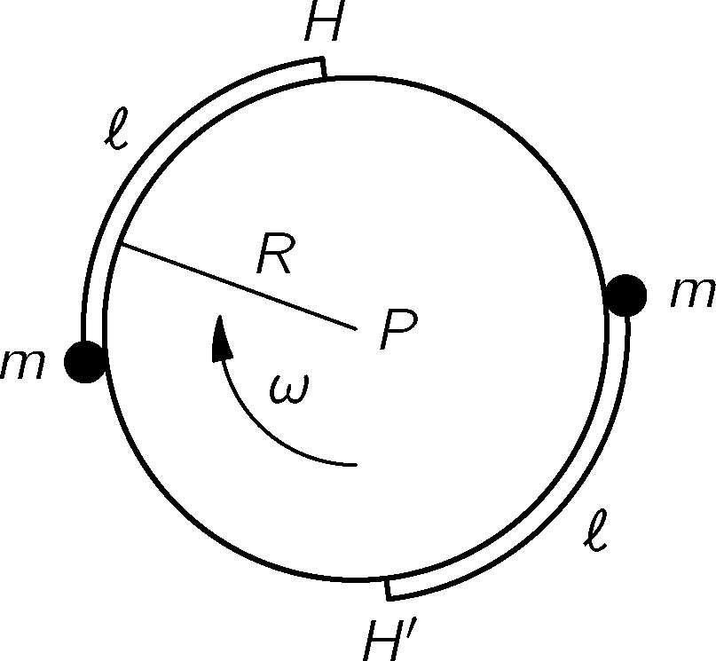 15.25 一半径为 R 、质量为 M 的均匀圆盘被设计为以其中点 P 为支点在水平面内以角速率 ω 自由转动。两小质量物体 m 用长为 l 、环绕在圆盘沿上的绳子系在盘沿上,如图15-15所示。当圆盘旋转时,同时释放两物体,而不干扰系统的角动量。当绳子向外展开到沿着径向时,立即将绳子从钉子 H 和 H' 上松开,两物体飞离圆盘。为了使圆盘在上述作用下停止运动,绳长 l 应为多少?