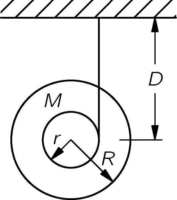 15.15 一个线筒由相同的两个圆盘和一个轴组成,每个圆盘质量均为 M ,半径均为 R ,轴半径为 r ,质量可忽略,如图15-8所示。有线缠绕在轴上,线的一端系在天花板上。线筒位于天花板下方 D 处,将其由静止状态释放。
