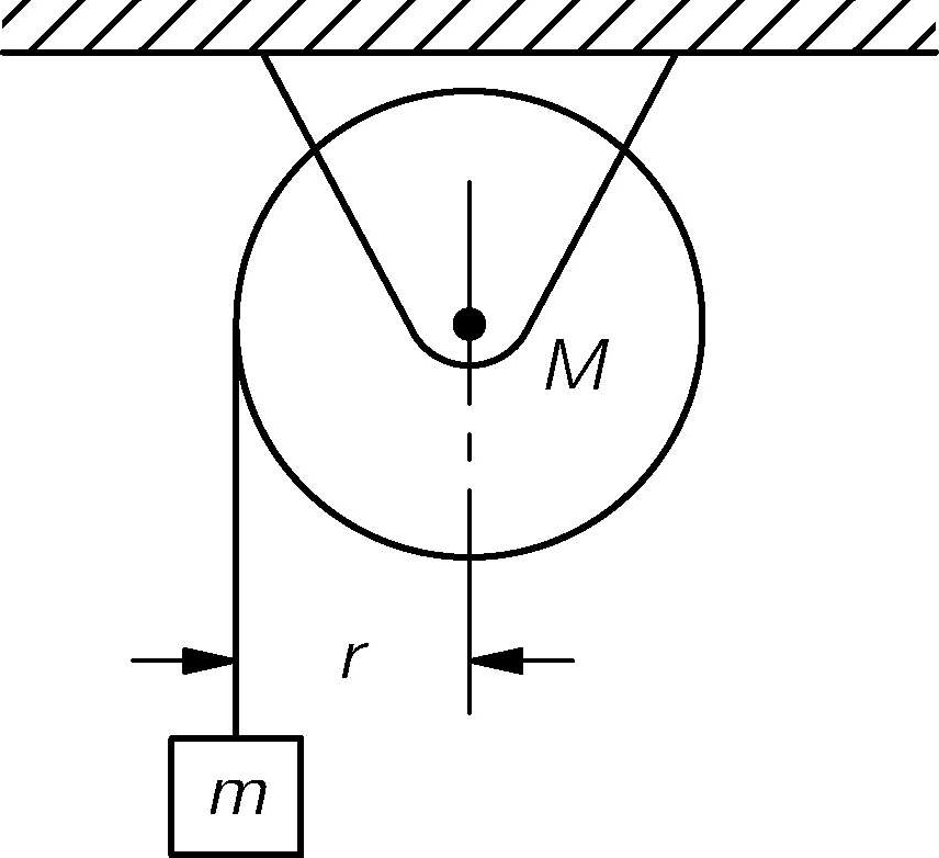 15.5 如图15-2所示,质量为 m 的物体挂在绳子上,绳子缠绕在质量为 M 、半径为 r 的实心圆柱体上,在无摩擦的轴承上转动。求物体 m 的加速度 a 。