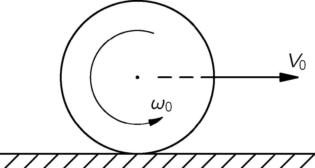 15.24 一个有趣的小游戏是将手指按压在水平桌面上的弹子上,弹子以图15-14所示射出,初始线速率为 V 0 ,初始向后的转动角速率为 ω 0 (绕与 V 0 垂直的水平轴转动)。弹子与桌面间的滑动摩擦系数是常数,弹子的半径为 R 。