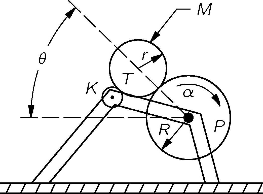15.21 图15-13是印刷机上的加墨装置。 K 是支撑牢固、可自由转动的墨辊,转动惯量可忽略不计。 P 是支撑牢固的印滚。 T 是可在 K 和 P 之间自由浮动的传递滚。 T 是半径为 r 、质量为 M 的实心圆柱,总在 K 和 P 之间无滑动地滚动。 T 、 P 的中心连线与水平方向成 θ 角。在保持 T 和 P 接触的情况下,求 P 的最大角加速度 α max 。