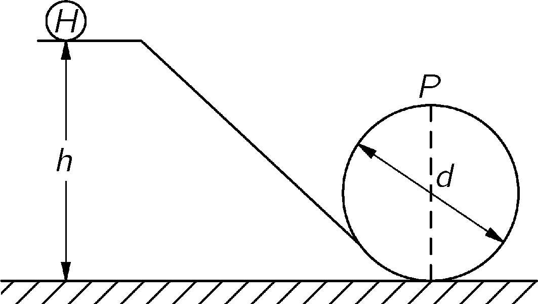 15.16 如图15-9所示,半径为 r 的圆环 H 无滑动地沿斜面往下滚。为了使圆环恰好达到“翻圈”所需速度,即正好使环在 P 点保持与圆轨道接触,圆环的初始高度 h 应为多少?