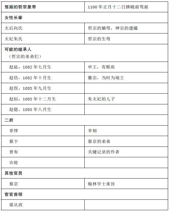 分别是章惇、蔡卞、曾布和许将(见表2.1),他们几位已在二府共事五年多。1100年正月十二日,这几位大臣来到东内门,等候宣召入宫。他们得知哲宗病情严重,原本计划当天在宫中及城内寺观举行祈祷仪式。
