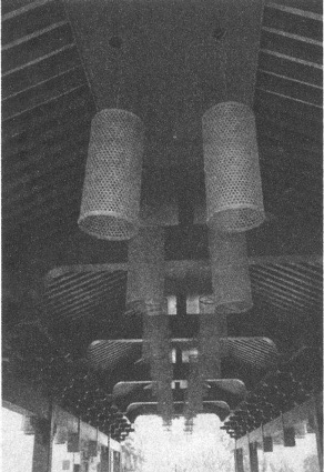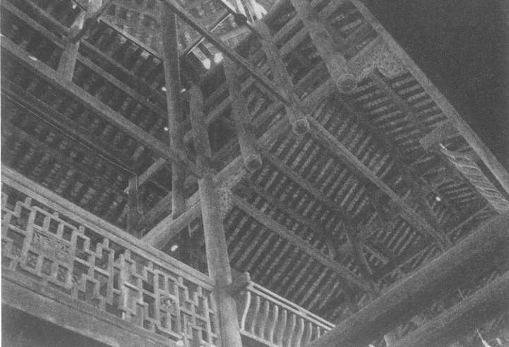 桥廊的屋顶木构架基本采用穿斗式处理,疏檩与密檩的穿斗构架形式针对具体情况而灵活地运用,堪称我国传统木屋构架综合运用的典范。这种结构可以形成高低错落、凸凹进退、丰富变化的形体,非常容易适应当地的地形地貌。所使用的柱、梁、枋、檩构件接头均用榫卯构造,不用一钉一铆,这也是我国传统木结构的重要特征和独到之处。