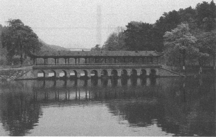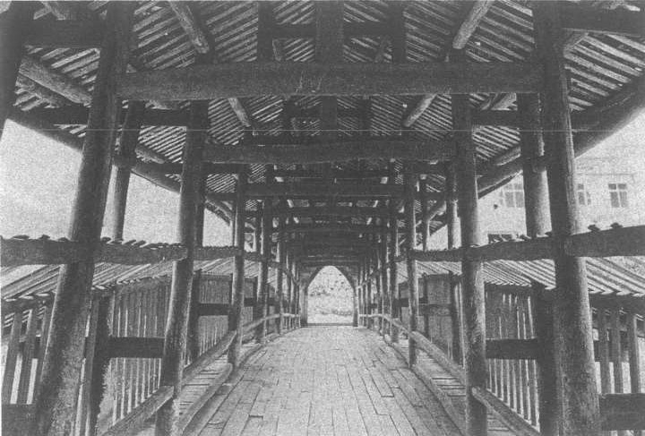 桥跨,为木结构。桥墩上放置两排杉木作为托架梁,墩台上采用悬臂托架来支撑主体桥跨结构。这种木结构的采用,既能减少河中桥墩的数量,又可增加河床的排洪量,同时由于就地采用未经修饰加工的原杉木,省时省料,从而大大减少了建筑成本。