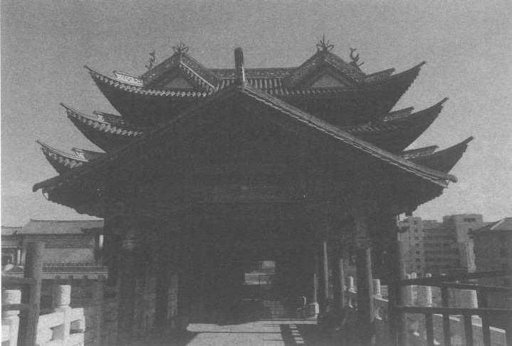 桥身部分的建筑装饰较少,两侧的木栏杆多采用正方形或长方形木条,不加任何雕琢,颇有唐朝古建筑遗风。