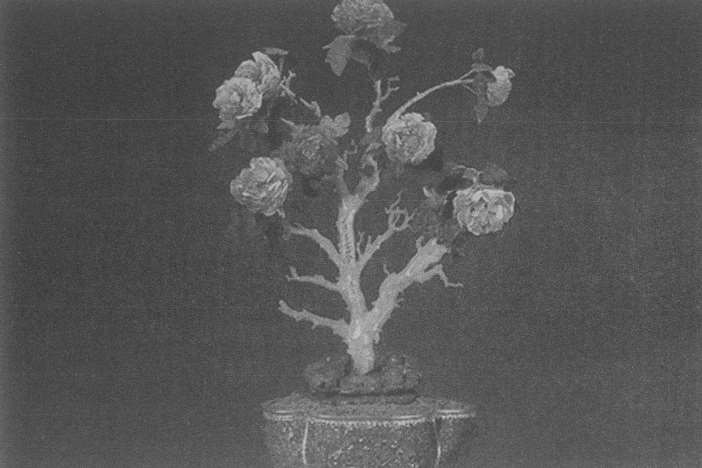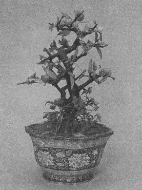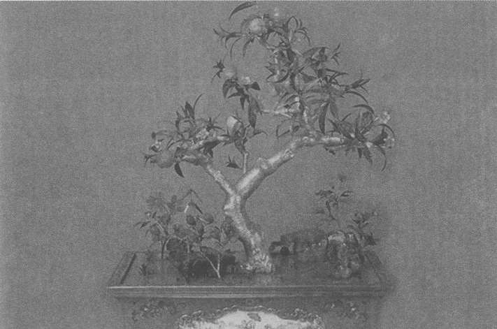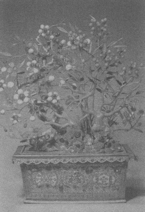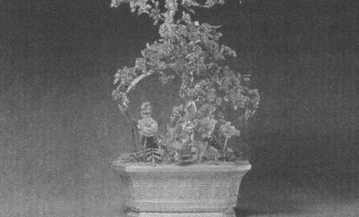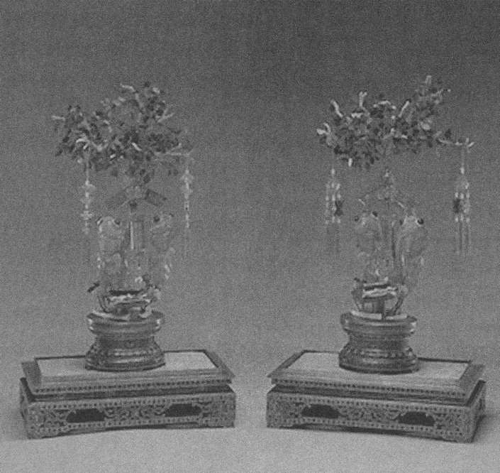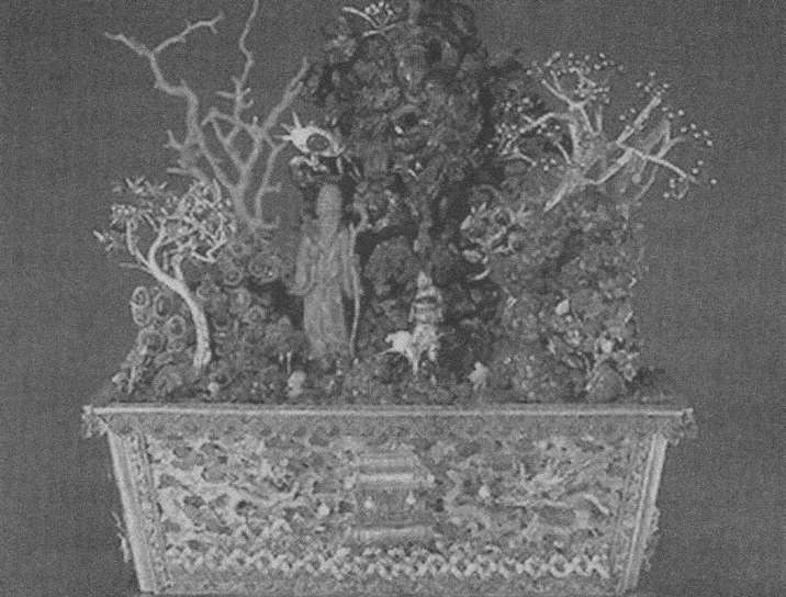 清代的“镶金缀玉的古代盆景艺术”代表了古代艺术盆景的最高峰,其中包括“碧儿桃树盆景”“碧桃花树盆景”“ 红油金漆龙埙”“嵌玉石仙人祝寿图盆景”“镶宝石九重春色图盆景”“蜜蜡料石刘海戏蟾盆景”“嵌珍珠宝石齐梅祝寿盆”“红珊瑚树盆景”“孔雀石嵌珠宝蓬莱仙境盆景”“珊瑚翡翠吉庆有余盆”“麻姑献寿盆景”“象牙嵌玉石水仙盆景”“碧玉万年青盆景”“珊瑚宝石福寿绵长盆景”“红宝石梅寿长春盆景”。我们可以用现代人的思维把“象牙嵌玉石水仙盆景”与“碧玉万年青盆景”分为一组,同时“嵌玉石仙人祝寿图盆景”和“孔雀石嵌珠宝蓬莱仙境盆景”由于有相同的特点而分为一组。