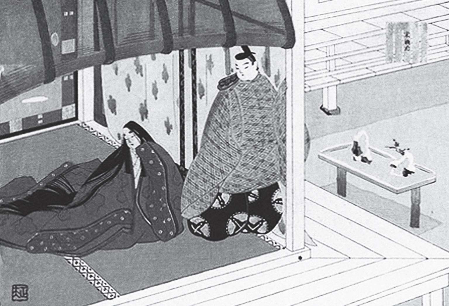 源氏公子见四下无人,便大胆走了进来。大辅命妇佯装吃惊,对小姐道:“这可如何是好?那源氏公子竟然来了!他常叫我替他讨回信,我一直拒绝。他总道:‘既如此,我当亲自去拜晤小姐!’现在是打发他走呢,还是……不过,他并非那种轻佻之人,不理睬他也实在不好。您就暂且隔帘和他谈谈吧!”小姐羞愧交加,嗫嚅道:“我可不会应酬呀!”她边说边往里退,像个怕生的小孩子。大辅命妇忍不住笑了起来,又劝道:“你也过于孩子气了!有父母教养之时,谁都难免有些孩子气,如今您孤单于世,仍不懂得人情世故,畏畏缩缩,这就无理可言了。”小姐素来柔顺,便答道:“我不说话,只听他说吧。”于是将格子窗关了,隔着窗子算是相会。大辅命妇道:“叫他立于廊上,未免有失礼仪。此人不会胡来,您只管放心就是。”她花言巧语说服了小姐,又亲手关了内室和客室间那纸隔扇,并在客室铺设了坐垫。