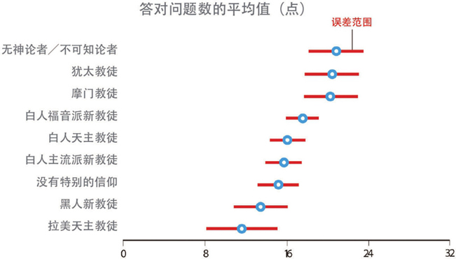 皮尤论坛采取了更严谨的分析——根据受试者的教育及收入背景(遗憾的是,这些数据在报告中很不明显)对结果进行修正。修正后,信徒和无信仰人士之间就没有明显区别了。那些声称不信神的人的平均得分比全国平均得分仅仅高了0.3分,考虑到如此大的误差范围,这点儿分差没有任何意义。