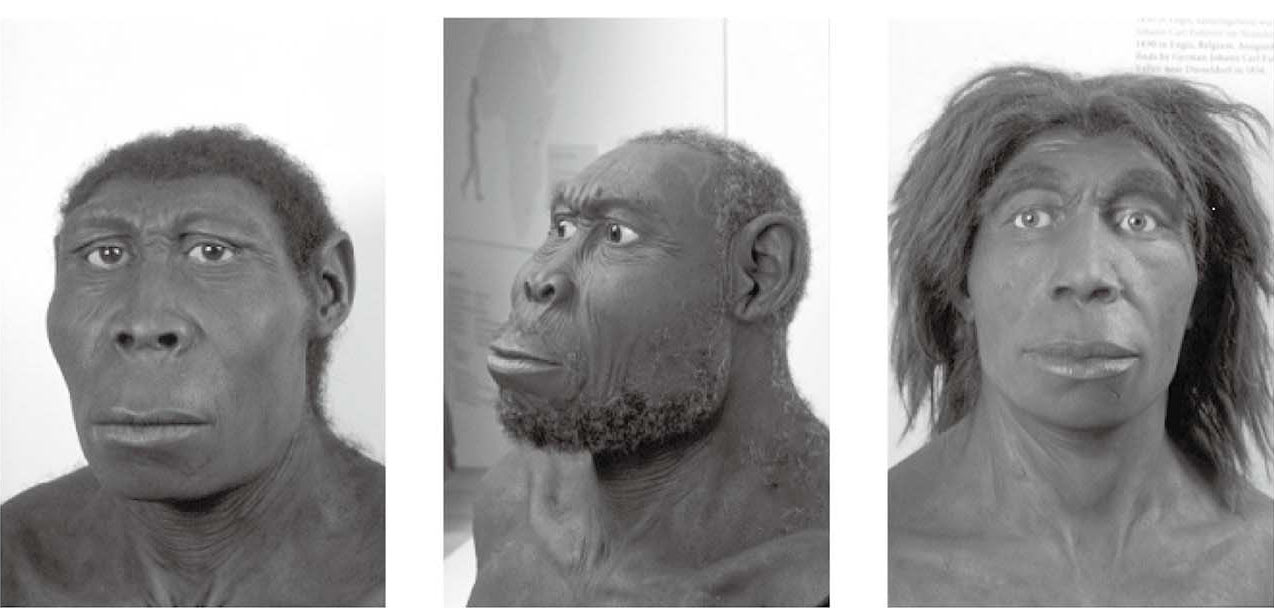 图2 这些都可说是我们的兄弟姐妹,据推测重建样貌(从左至右):鲁道夫人(东非,距今大约200万年);直立人(东亚,距今约200万—5万年);尼安德特人(欧洲和西亚,距今约40万—3万年)。他们都是“人类”。