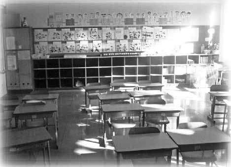 教室前方的黑板左侧(靠近学校庭院的一侧)摆放着讲桌,教室后面是木制储物柜,上方的展览板上贴着学生们的画作。这不是和过去一样嘛!只是课桌的数量比我上学时少多了。