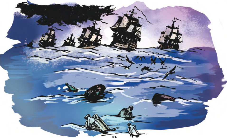 从那些所谓的马夫的谈话中,我了解到远征队的其他成员。一共有四艘船用来运送军队,大家的情况都差不多,不过其他船上的人一天能喝上三次朗姆酒,天气好的时候还可以去甲板上转转。士兵被严密地监视着,然而依旧有些人表现出不爱国的倾向,跳进了大海。那艘叫作“雷鸣”的船最舒适,专供长官和他的仆人们使用。此外,这次远征还派有四艘护航舰,分别叫作:“无法”号、“无能”号、“无用”号和“无理”号。