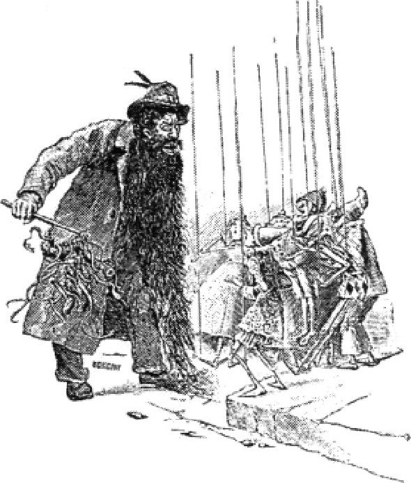 从长相来看,戏班班主又丑又吓人,给人一种毛骨悚然的感觉。他还长着和墨一样颜色的长长的黑胡子,从下巴一直拖到地上。胡子下面是炉灶一般大的嘴巴,两只大眼睛里充满了血丝,像要着火的红玻璃灯笼。他时常拿着一条用蛇和狐狸尾巴做成的粗鞭子,动不动就“噼里啪啦”地抽几下。
