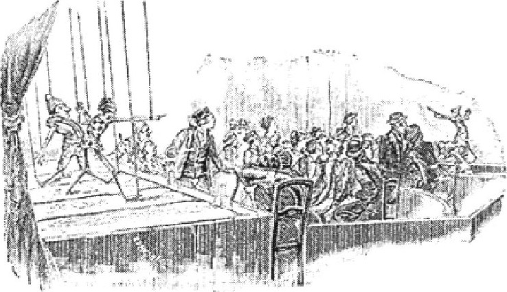用课本换了4个索尔多,皮诺曹便踏进了戏院。这时木偶戏已经开始了。舞台上有两个小木偶正在表演,他们和平时一样,正在打嘴仗。接下来上演的就是他们相互厮杀的场面了。