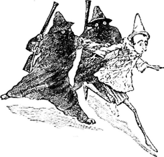 皮诺曹以为两个劫匪不会再追上来了。结果呀,他回头一看,他们竟然从沟里爬上来,继续追他。这两个家伙全身都浸满了水,套在他们身上的麻袋里也灌满了水,他们一边跑着,身上还不断漏水,就像两只漏了底的篮子。