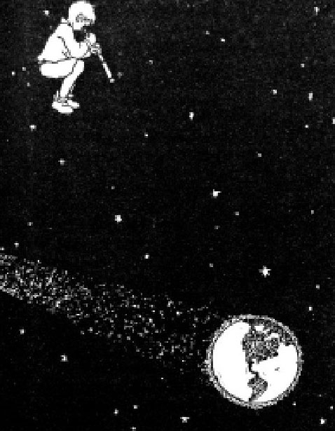 通过一个小望远镜在遥远的天空中看到的地球,恰如一轮满月——圆而洁白。但它的圆,并不像盘子那样,而是像一个大雪球那样。准确地说,它也并不是洁白,而是明亮。正如汽车的前灯能将夜晚的道路照亮一样,太阳的照射使得这个大球——我们的地球——变得明亮了。当然,同一时间太阳只能照亮地球的一面,所以它的另一面是黑的,但地球总是在不停地旋转,因此另一面也会被阳光照射到。