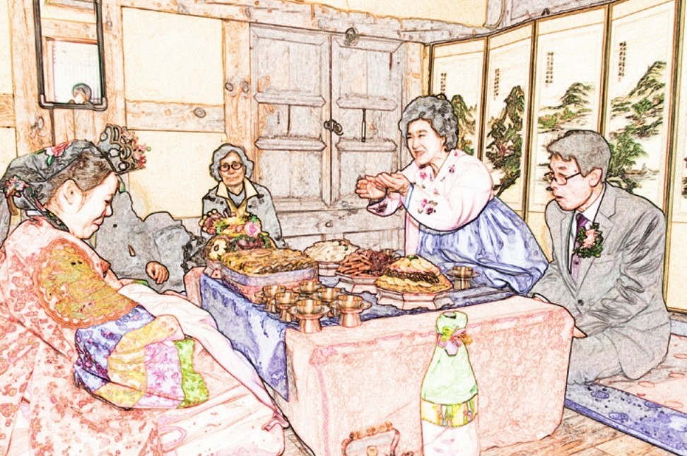 전통명절에 사람들은 전통한복을 입고 명절을 축하해요.