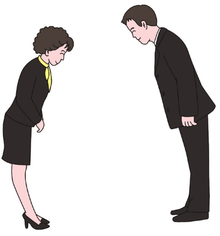 问候时的手势也有讲究,女人要双手合握,右手放在左手上面。男人的双手轻握,就像握着鸡蛋一样,轻轻地放在裤线上。问好的时候,除了要低头,脖子和腰也要呈一条直线弯下去。如果是郑重的问候,鞠躬时要成15 °,保持3~4秒,其中鞠躬45°保持4秒,是最郑重、最理想化的问候方式。
