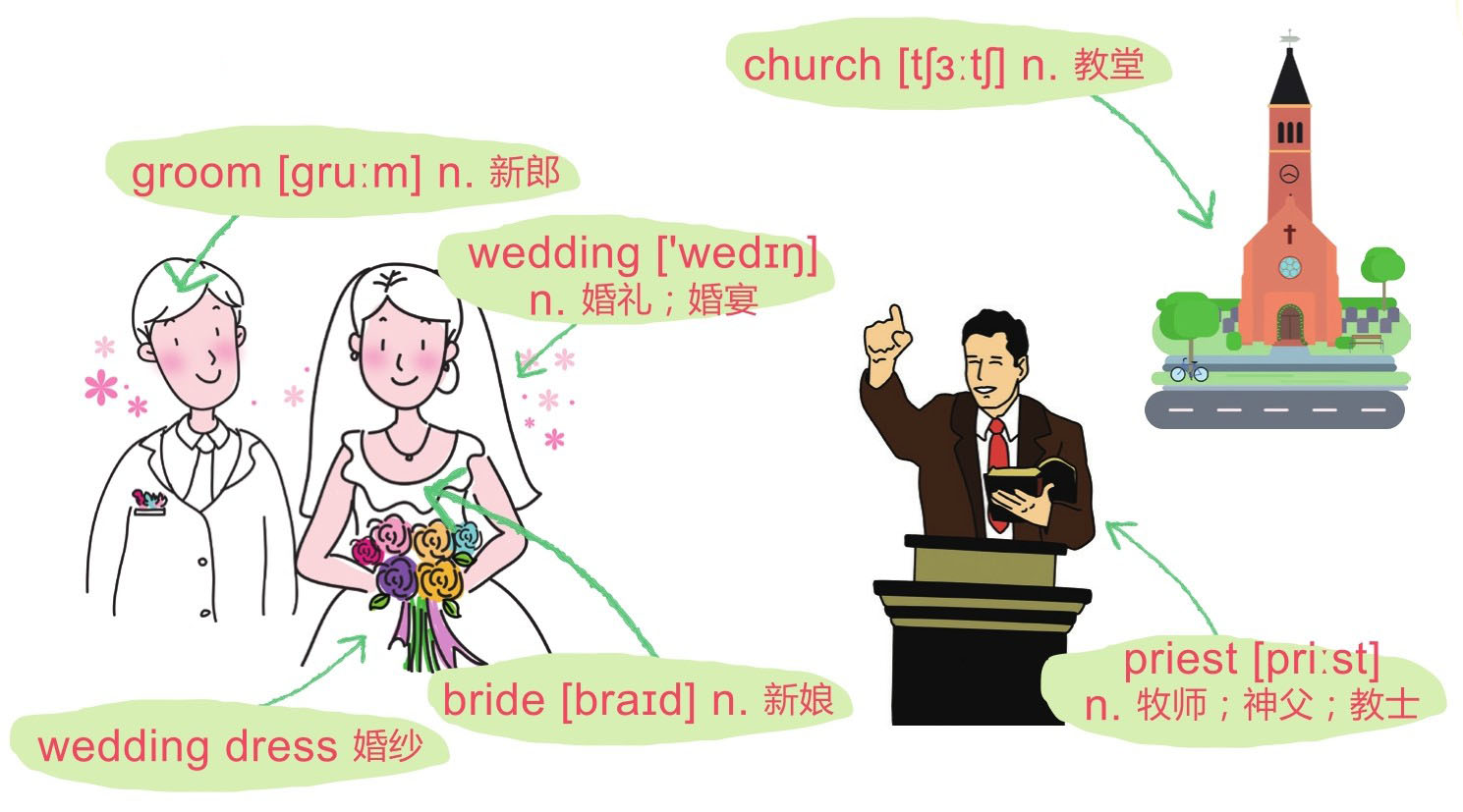 The groom and best man arrive at the church first, and then the guests arrive. Last to arrive is the bride , normally dressed in a long white wedding dress , her face covered in a veil, carrying a bouquet of flowers, and accompanied by a couple of bridesmaids in matching dresses. Usually the bride's father walks her down the aisle until they reach the priest at the altar. The church organ plays the Wedding March , and the guests rise to their feet to watch the procession. Once they reach the altar, the bride stands with the groom, and the service begins. The priest always asks if there are any objections to the marriage (someone can speak or forever hold their peace — never have the opportunity again to object), then the couple exchanges rings . At that point, the groom is allowed to kiss his wife . Next is the reception, which is often a formal lunch in a hotel. After lunch the bride's father normally gives a speech, and the bridegroom and or the bride give a short speech to thank their guests. At the end of the day, the happy couple traditionally leaves on honeymoon .