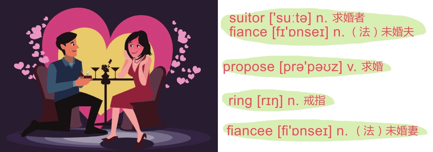 一切开始于求婚。传统上,男方会 单膝下跪 来 求婚 。如果他得到的回答是“我愿意”,那么他们就 订婚 了。通常,男方都会给他的 未婚妻 买 订婚戒指 ,多数是钻戒。订婚的时间可以持续好几年,如果任何一方都没有 取消婚约 的话,下一步就是结婚了。