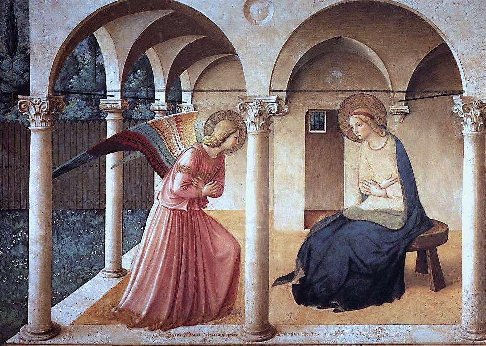 安吉利科的这幅《天使报喜》采用了透视法的画法,画风简单直接,并且很好地利用了光线效果,勾勒出了空间深度,人们尊敬地称呼他“天使画师”。