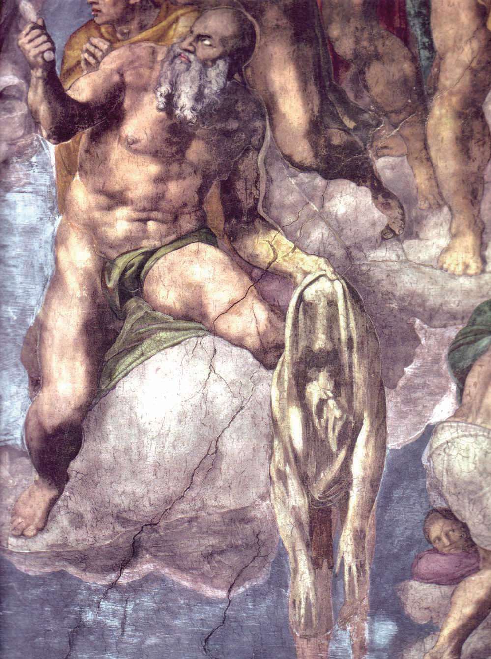 大约在米开基琪罗完成穹顶画三十年后,他又被请去画另外一幅画,这次是在西斯廷教堂祭祀台一端的墙壁上画画。但是,这面墙壁已经被彼鲁其诺的画占满了,这就不得不先把旧画毁掉。米开朗琪罗画在墙上的作品是 《最后的审判》 。虽然它比不上那六幅穹顶画那样伟大,但这是世界上最著名的画之一。这幅画画的是在审判日那天大群的男女起死回生的场面。
