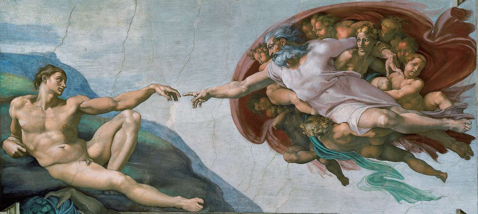 你看到的下面这幅图,展示的是穹顶画的一小部分,它说的是上帝造人的画面。注意看亚当宽阔的肩膀和结实的肌肉。