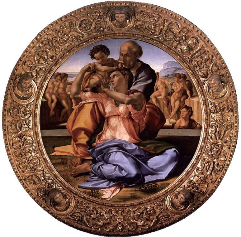 尔后,米开朗琪罗再没有画过其他的画了,我们可以确定完整地由他完成的一幅小画是圆形画《圣家族》。画上圣母马利亚双膝跪在地上,手里托着圣子越过肩头,以便让约瑟可以看到他。这幅画说明这位画家很喜欢把人画成奇怪的姿势。