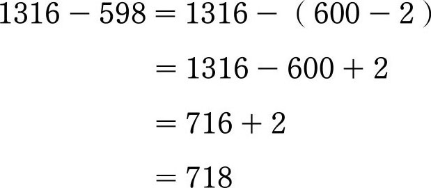 其实我们只是比原题“多减”了2,只要再将多减去的2还回来,就可以得到原题1316-598的答案718了。