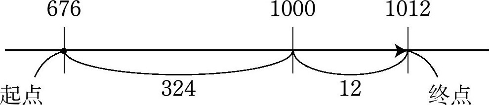 像这样,减法的概念和距离的概念就紧密结合在了一起。我们也可以将上图所示的676作为出发点(起点),将1012作为终点。