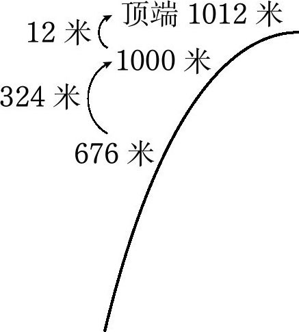 用上一节的方法,从676米到1000米需要324米。最后还剩12米,即676米到顶端的高度差为336米。