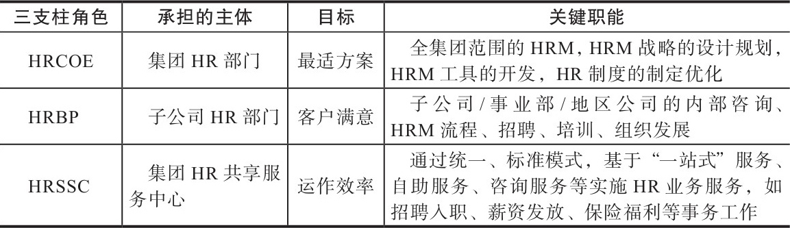 总体上,HRCOE和HRBP属于“专业层”,强调人力资源专业能力、专业领域的产品研发、人力资源管控,以及面向子公司的个性化咨询解决方案;HRSSC属于“服务层”,强调基于E-HR信息系统为员工提供标准化的共享服务,为各级人力资源部门提供基础数据、信息分析等HR管理支撑业务。