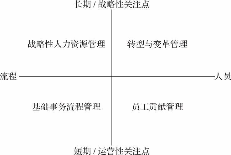 图1-16描述了HR人员作为业务伙伴所必须扮演的4个关键角色。图中的两轴分别代表HR人员的关注点与活动:纵轴是HR人员的关注点,范围涵盖了从长期/战略性到短期/运营性关注点;横轴是HR工作的活动范围,涵盖了从流程(人力资源工具与系统)到人员管理活动。这两条轴线描绘出了4个主要的人力资源角色:战略性人力资源管理、基础事务流程管理、员工贡献管理、转型与变革管理。每个角色的成果/产出、比喻和对应的活动如表1-7所示。