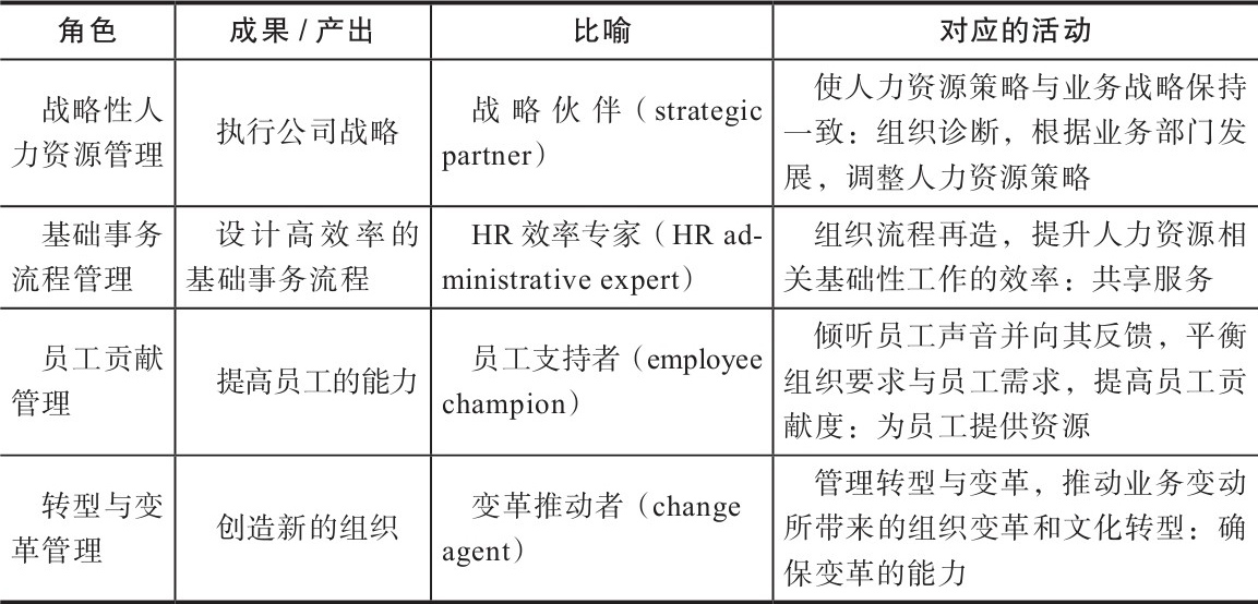 表1-7 HRM各角色的成果/产出、比喻和对应的活动