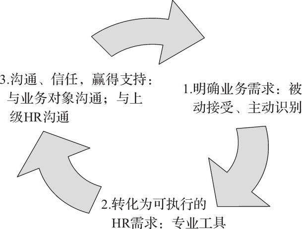 通过企业实践案例的调研和分析,我们提出了具有相互循环促进作用的HRBP角色实现的三步曲,如图2-4所示。