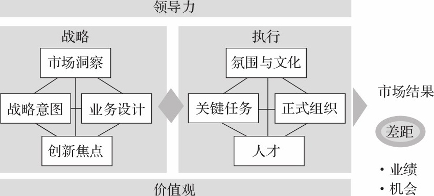 (1)战略的制定。从业绩差距和机会差距出发确定“我们在哪里”。组织的战略是由不满意激发出来的,而不满意是对现状和期望之间差距的一种感知。这种差距表现在:第一,业绩差距,即现有经营结果和期望绩效之间的差距;第二,机会差距,即现有经营结果和新的业务设计所能带来的经营结果之间差距的量化评估。一般认为,业绩差距可以通过高效的执行来填补,并不需要改变业务设计。但是,填补一个机会差距需要有新的业务设计。