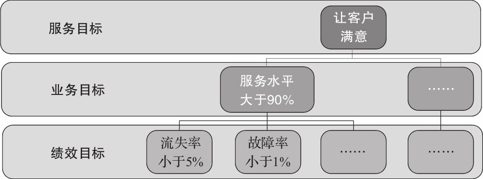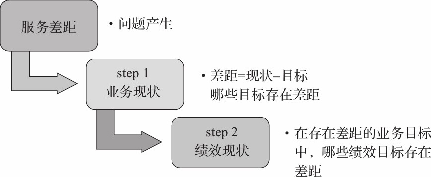 2)分析服务现状。从上述目标层次来看,当组长发现服务目标出现偏差时,需要追根溯源地寻找绩效目标的问题点,找到根本原因,解决问题和服务优化改进则是在绩效目标层(见图2-14)。