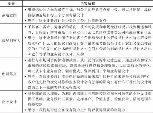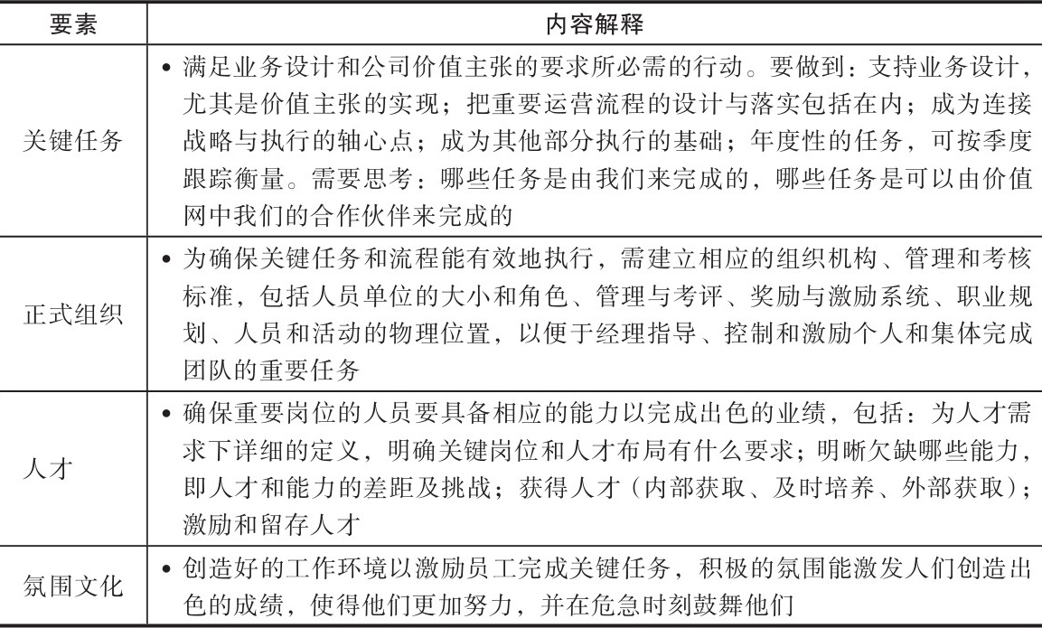(3)战略的执行。战略设计完成后,更重要的是落实战略的执行。根据业务设计的要求重新全面思考调整影响执行的各个要素,才能使战略不等于纸上谈兵。战略执行的落实体现在表2-7中。