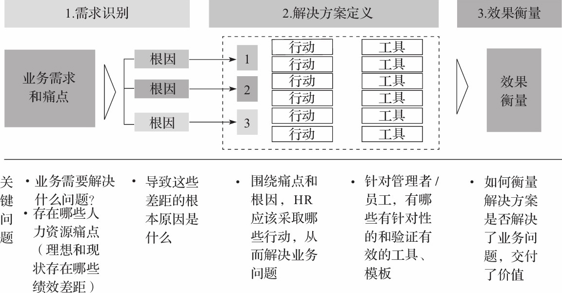 (3)P(pin down the causes),探求原因。产生业务绩效差距问题的因素主要包括组织外部因素、组织内部因素和个人内部因素三个方面。组织外部因素指不受组织内任何人员控制的因素,很难改变。HR可以聚焦组织内部和个人内部因素。组织内部因素是组织可以控制的因素,包括角色与期望、辅导与强化、激励等。个人内部因素指员工个人按要求完成工作所必需的能力因素。分析原因时,HR最好不要习惯从自己作为HR的角度切入,过早引导到“人”的问题上,而是先倾听业务领导的分析,慢慢挖掘深层次的业务痛点,帮助和引导对方梳理业务现状与问题,澄清业务需求,站在探索问题、解决问题的角度,而非营销自己预设的解决方案,这样才能与业务领导同频对话。