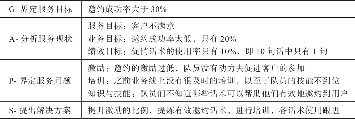 4)提出解决方案基于定位的问题我们提出解决方案,改进呼叫中心运营绩效。例如,某电销团队的邀约成功率太低,客户不满意,该公司通过运用GAPS模型,做了如表2-8所示的分析并运用到其改进过程中。