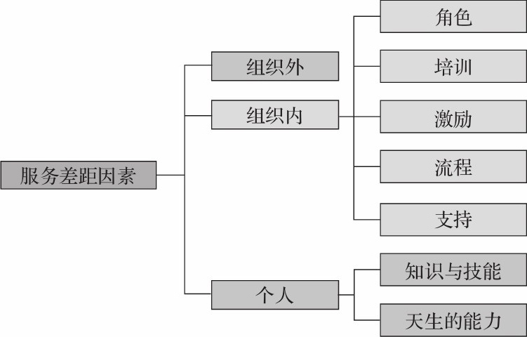 3)界定服务问题。如何去寻找绩效因素呢?绩效改进中,为我们提供了一个叫作“差距缩小器”(gap zapper)的分析工具,如图2-15所示的三个维度、七种绩效方面的原因可以作为绩效问题定位。在定位问题的过程中,将最大的改进注意力放在“组织内”这个维度,因为运营管理,需要将注意力放在自己可以控制并可以影响的范围内。组织内的因素有些我们可以去改变,有些我们可以去影响。组织外的因素,我们最多只能影响,基本没有改变的能力。