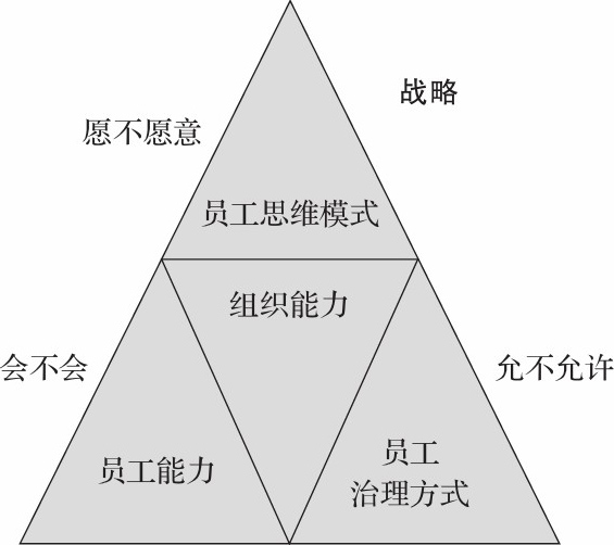 (2)员工思维模式(愿不愿意)。员工会做不等于愿意做,因此打造组织能力的第二个支柱是打造员工的思维模式,让大家每天在工作中所关心、追求和重视的事情与公司所需的组织能力匹配。“员工思维”反映思考与解决问题的方式,价值观是否一致。公司要考虑的具体问题包括:什么是主管/员工需具备的思维模式和价值观,如何建立和落实这些思维模式与价值观。