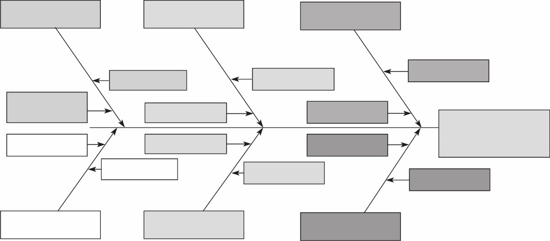 (1)鱼骨图定义。问题的特性总是受到一些因素的影响。我们通过脑力激荡找出这些因素,按相互关联性整理而成的层次分明、条理清楚,并标出重要因素的图形就叫特性要因图。因其形状如鱼骨,所以又叫鱼骨图(fish bone diagram)。它是一种透过现象看本质的分析方法,于1953年由日本管理大师石川馨先生提出,因此又称为“石川图”,如图2-10所示。鱼骨图由结果、原因和枝干三部分组成。其中,“结果”表示期望进行改善、追查和控制的对象,“原因”表示对结果可能施加影响的因素,“枝干”表示原因与结果、原因与原因之间的关系。中央的枝干为主干,用双箭头表示。从主干两边依次展开的枝干为大枝(大原因即直接原因),大枝两侧展开的枝干为中枝(间接原因),中枝两侧展开的枝干为小枝(造成间接原因的上一层原因),用单箭头表示。在一个系统中,下一阶段的结果,往往是上一阶段的原因造成的。用鱼骨图,可把引起结果的错综复杂的因果关系通过一张图直观地表述出来,用以分析结果产生的原因和研究达成结果的措施。这种方法属于定性分析方法,使用方便、层次分明、简明直观。