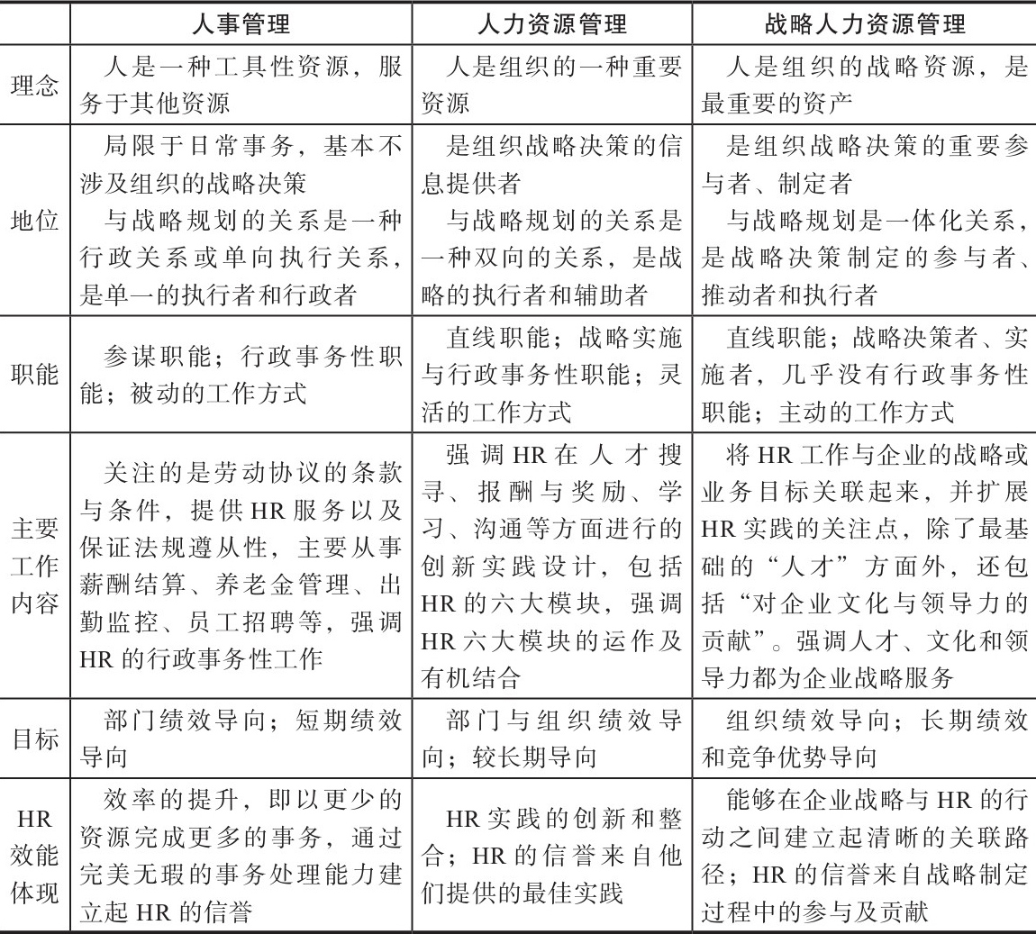 一般认为,人力资源管理的发展经历了人事管理、人力资源管理到战略人力资源管理三个阶段。三者在管理理念、管理地位和管理目标等方面存在较大的差异性。表1-1对三者的特点进行了比较分析。