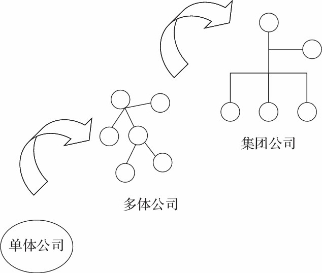 当企业进一步发展形成多体公司时(见图1-1),HRM主体就不仅仅局限于上述分工了,还存在人力资源管理的垂直分工。这种纵向分工反映在垂直层面上,多体公司不同层级的人力资源管理主体之间责任和权利的分配。比如,多体公司中母公司、子公司甚至孙公司分别承担什么样的招聘工作,纵向层面上三个不同的层级在人才培养上是怎样的分工。HRM的垂直分工,本质上就是人力资源管控体系的设计。