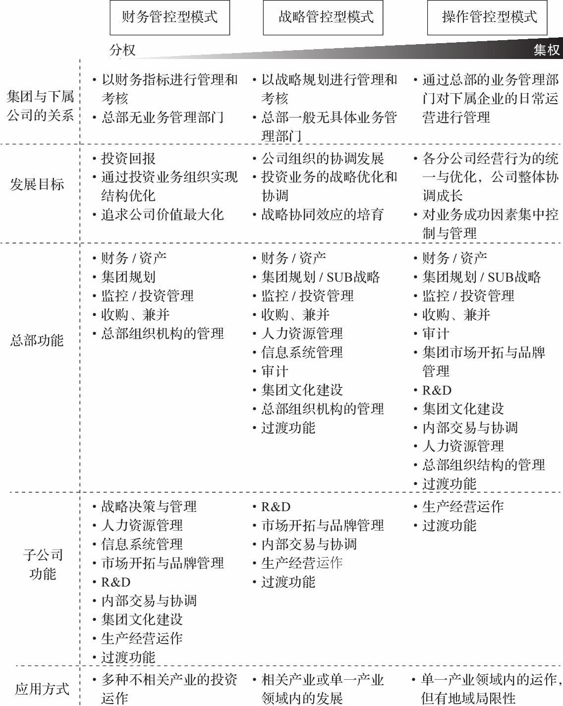 在这三种模式的基础上,还可以衍生出财务战略型和战略操作型两种混合模式。其中,财务战略型介于财务管控型和战略管控型之间,而战略操作型介于战略管控型和操作管控型之间。三种典型管控模式的主要特征如图1-2所示。它们在总部功能上也表现出较大的差异。